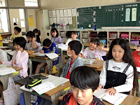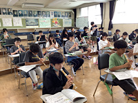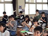 6年1組です。音楽の授業をしていました。「演奏による表現のちがいをきき取ろう」ということで、ベートーベン「運命」を鑑賞し、鑑賞文を書いていました。その後、「せん律やひびきの変化をとらえて演奏しよう」ということで、リコーダー「マルセリーノの歌」を、一生懸命に練習していました。近々リコーダーのテストがあるそうですが、指を見ないで、前を向いて吹けるとよいそうです。