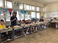 5年3組です。どもたちが計画をして、給食の時間にお楽しみ会を開きました。教務主任、英語専科、校長が招待され、漫才を披露してくれたりおしゃべりをしたりしました。楽しい時間を一緒に過ごすことができました。