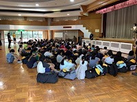 野外活動(5年生)② 公開日 2025/09/13 更新日 2026/03/04 学校生活のようす 美浜自然の家に、予定よりも早く到着しました。学年全体及び学級ごとに写真を撮った後、講堂に入り、入所式を行いました。所員の方への挨拶をし、その後、所員の方から2日間の過ごし方の説明を聞きました。所員の方が、皆さんの聞く姿勢や返事を褒めてくださいました。 5年生 今日の出来事