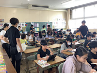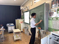 6年2組です。現職教育の一人一実践の授業を行いました。算数科の「立体の体積」の単元で「複雑な図形の体積を工夫して求めよう」をテーマに行いました。バウムクーヘンやチョコレートなど、身近な物に例え、分かりやすく授業を進めました。