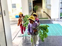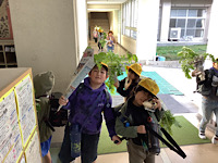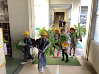 2年生が、大根を収穫しました。うれしそうに持って帰るところでした。葉っぱも立派で、料理に使えそうですね。食卓には、どんな大根の料理が並ぶのでしょうか。楽しみですね。