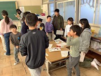 きのみランド(1年生・6年生) 公開日 2025/12/12 更新日 2026/03/16 学校生活のようす 12月12日(金)の2時間目に、1年生が6年生を招待して「きのみランド」を行いました。「きのみつりやさん」「どんぐりピューンピューンやさん」「もぐらたたきやさん」など、1年生が一生懸命に考えたゲームを、ペアの6年生と一緒に行ったり、さまざまなゲームのところを一緒に回ったりしました。6年生は、お兄さんやお姉さんの顔になって、優しく1年生をリードする姿は、とても頼もしく感じました。 1年生 6年生 今日の出来事