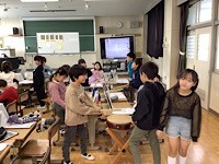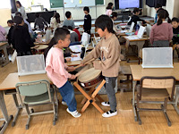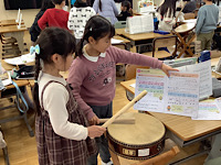 2年1組音楽の授業の様子です。「おまつり音楽」という単元で、「おまつりの音楽をつくろう」というテーマの下、太鼓を使って、お祭りのリズムに親しんでいました。一人一人が考えたリズムを、グループ内の違う友達が演奏し、さまざまなリズムを楽しんでいました。日本の楽器に触れられるよい機会になりました。