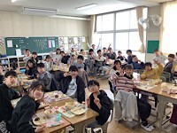 今日は、6年生のお祝い給食でした。ふだんお世話になっている先生を招待して、一緒に会食しました。メニューは「知多牛ハッシュドビーフ、牛乳、チキン、サラダ、揚げパン(チョコ味)、いちごケーキ」でした。いつも以上に賑やかで、楽しい時間になりました。