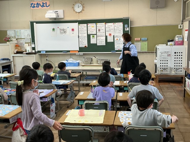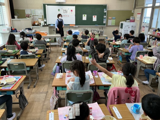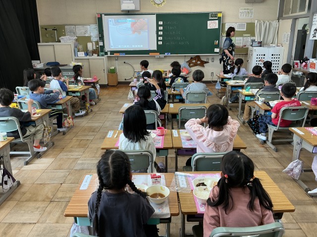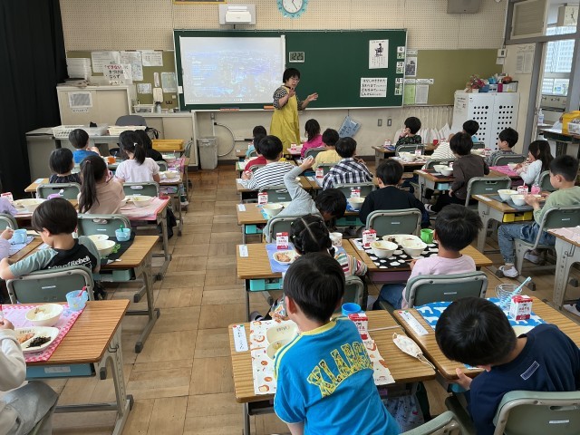 本日から、1年生の給食が始まりました。メニューは「ご飯・牛乳・玉葱の味噌汁・チキン竜田揚げ・ひじきの炒め煮」でした。初めての給食ということで、楽しみにしていた人が多くいました。給食から「地域の産業」「伝統行事や行事食」「日本や世界の食文化」そして「環境への配慮」などが学べます。給食センターや給食パートさん、給食に関わってくださっているたくさんの方々、そして動物のいのちにも感謝しながら、おいしくいただきましょう。