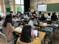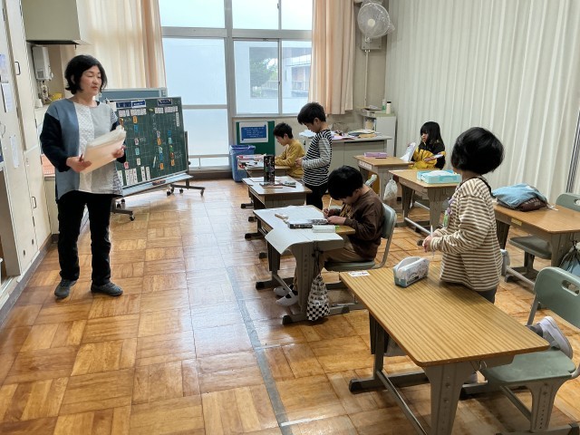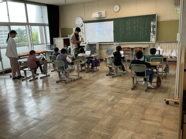 3年1組は、理科の授業「生き物をしらべよう」で、中庭にいました。たんぽぽを探し、タブレット端末を使って、細かいところやさまざまな角度から、観察をしていました。けやき2組は、算数の計算プリントに取り組み、終わった人からタブレットを使って確認をしていました。さつき3組は、国語の授業で「白いぼうし」の内容を読み取っていました。落ち着いた環境で取り組んでいました。