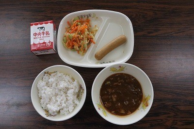 むぎごはん・牛乳・ハヤシライス・フランクフルト・にんじんサラダ
