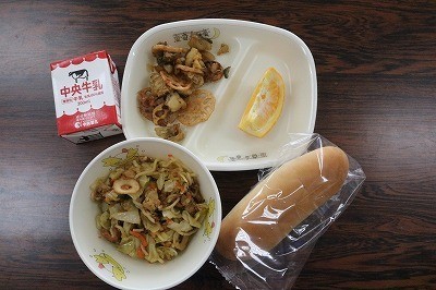 あいちのこめこいりパン・牛乳・やきそば・たらとれんこんのからあげ・いよかん
