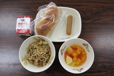 あいちのこめこいりパン・牛乳・やきそば・フランクフルト・いちごゼリーいりポンチ