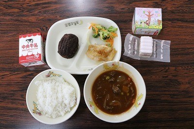 ごはん・牛乳・知多牛ハッシュドビーフ・照り焼きチキン・ココア揚げパン・ブロッコリーサラダ・お祝いデザート
