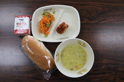 ミルクロールパン・牛乳・チキンナゲットのケチャップソースかけ・キャロットサラダ・とうにゅうコーンスープ
