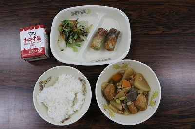 ごはん・牛乳・ちくわのこめこいそべあげ・しそひきじきのあえもの・だいこんとぶたにくのにもの