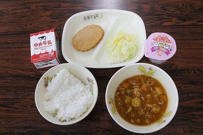 ごはん・牛乳・カレー・ハムステーキ・コールスローサラダ・おいわいデザート
