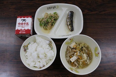 ごはん・牛乳・いわしのうめに・やさいととりにくのあえもの・さわにわん