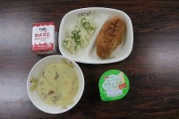 きなこあげパン・牛乳・はなやさいのとうにゅうシチュー・チキンサラダ・ヨーグルト...