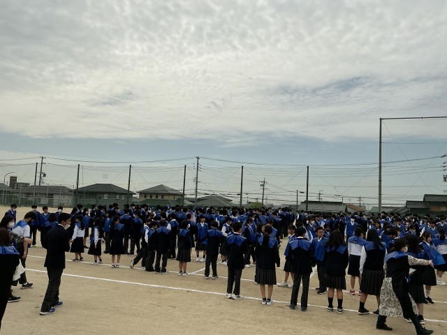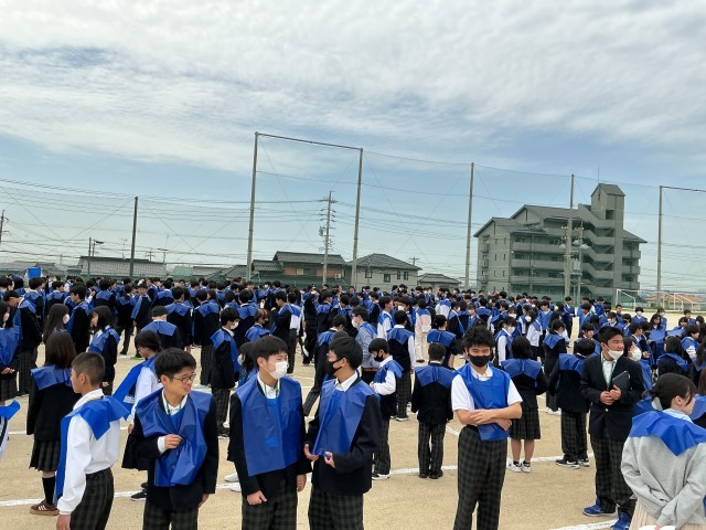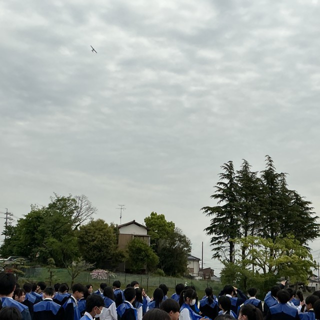 創立80周年の記念行事として、全校で航空写真を撮影しました。上空からセスナ機による撮影で、生徒一人一人が青色のエプロンを着て、校章を人文字で表しました。できあがりが楽しみです。