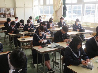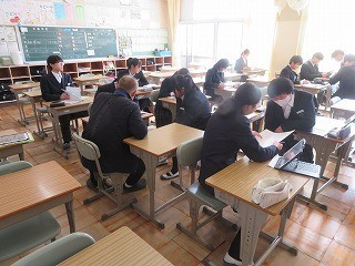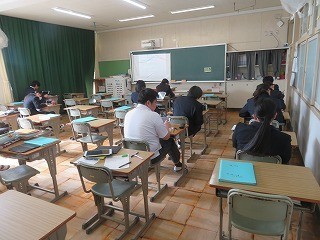 授業の様子です。 公開日 2026/01/21 更新日 2026/01/21 学校のようす 1月21日(水)の3時間目の様子です。音楽や美術の授業の様子です。3年生は、私立・専修学校の一般入試のため、教室にいる生徒の数は少なかったですが、静かに自習をしていました。 +1