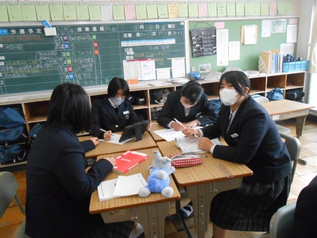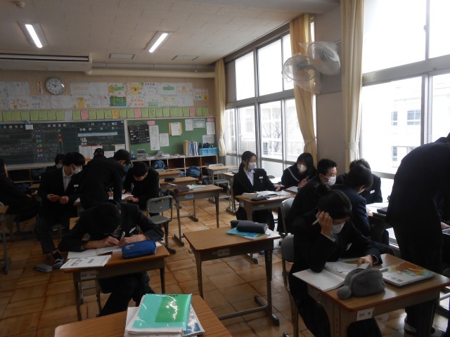 卒業まであと10日。そんな中、公立一般入試もあとわずか。公立一般受検をする生徒はラストスパートで勉強に励んでいます。すでに合格している生徒は静かに応援しています。分からない問題は互いに教え合い、みんなの力で底上げをしています。放課には、わきあいあいとよい息抜きができています。これからも卒業までの大切な時を有意義に過ごしていきたいと思います。