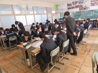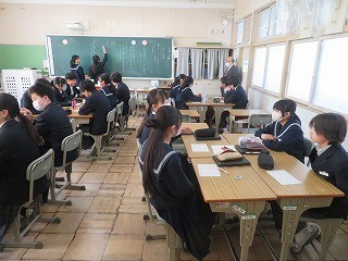 授業の様子です。 公開日 2026/02/20 更新日 2026/02/20 学校のようす 2月20日(金)の3時間目の様子です。1年生では、英語科の会話。2年生では社会科のマッピング作成や道徳の話し合い。3年生では、英語科のテストを行っていました。 +2