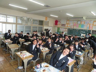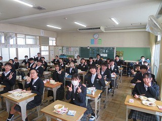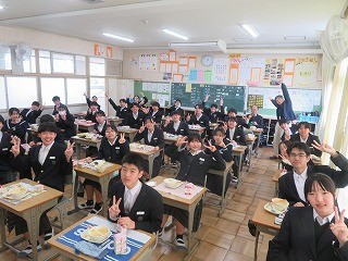 卒業お祝い給食がありました 公開日 2026/03/03 更新日 2026/03/03 学校のようす 3月3日(火)の3年生の給食は「お祝い給食」でした。卒業のお祝いとして1・2年生とはメニューが異なり、とてもおいしく楽しくいただきました。みんなもとてもよい笑顔でした。 +2