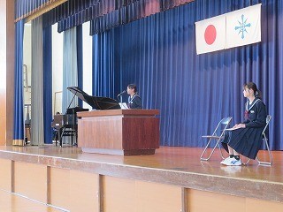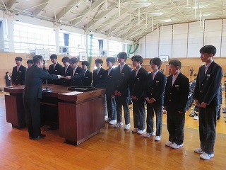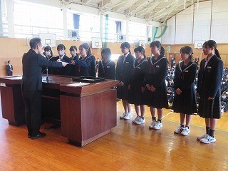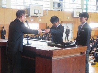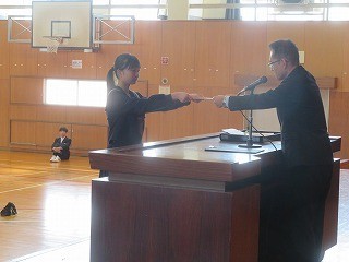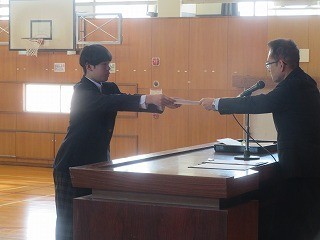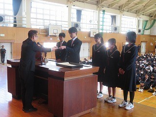 3月24日(火)には、修了式が行われました。校長先生より1・2年生の代表に修了証が渡され、「学ぶこと」についての話がありました。式の後には、令和8年度前期生徒会の任命式と表彰がありました。また、生徒指導担当の先生から春休みの過ごし方について話しがありました。春休みには、1年間をふり返り、新しい気持ちで4月を迎えてください。
