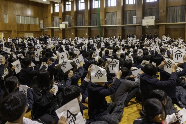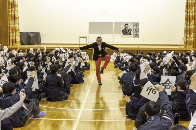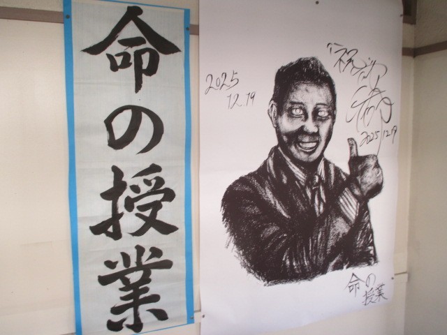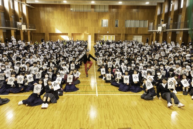 生徒たちは、事前に一人一人が「命」という字の習字を書き、ゴルゴ松本さんが登場するときに一斉に「命」を掲げて歓迎しました。