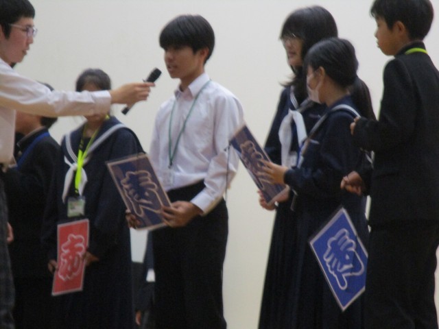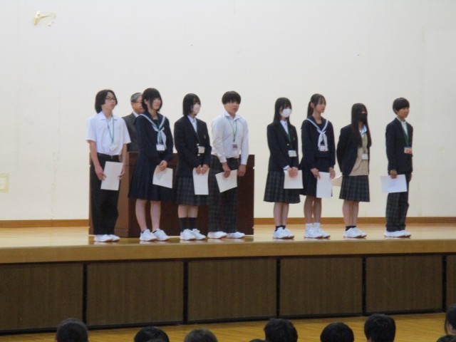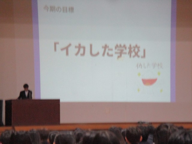 全校集会では、学級3役と前期委員長の任命式や生徒会の今後の方針発表、縦割り班の色決めなどが行われました。