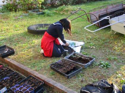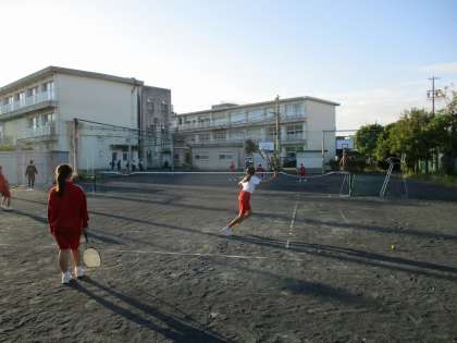 サブグラウンドではソフトテニス部が明日の大会に向けて練習をしていました。中庭では園芸委員がパンジーの植え替えをしていました。