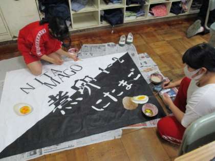 今日は運動場が使えないので屋内での活動となりました。1年生は、学級旗や小道具を作成していました。