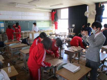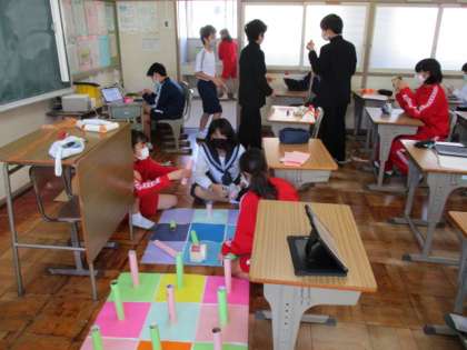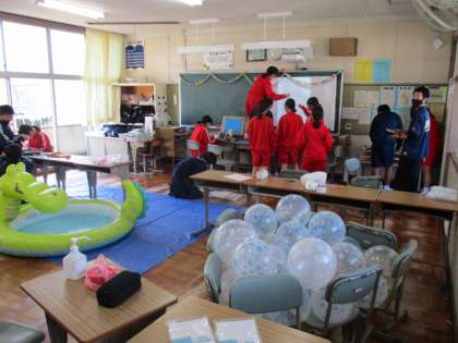 明日から学校祭が始まります。午後はその準備をしました。まずは1年生の準備の様子をお知らせします。文化祭に向けて会場作りから小道具作りなどをしました。
